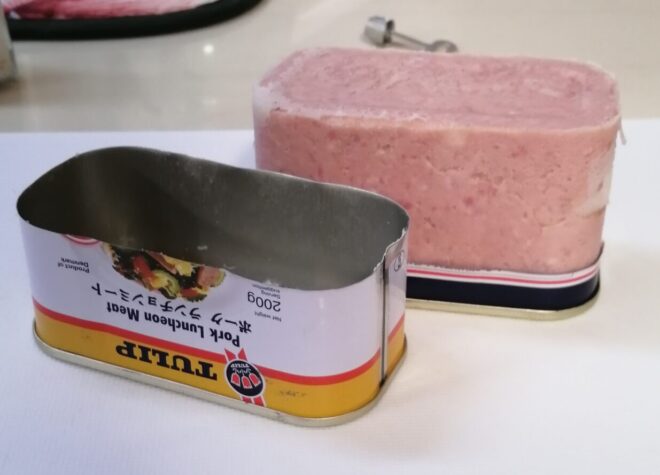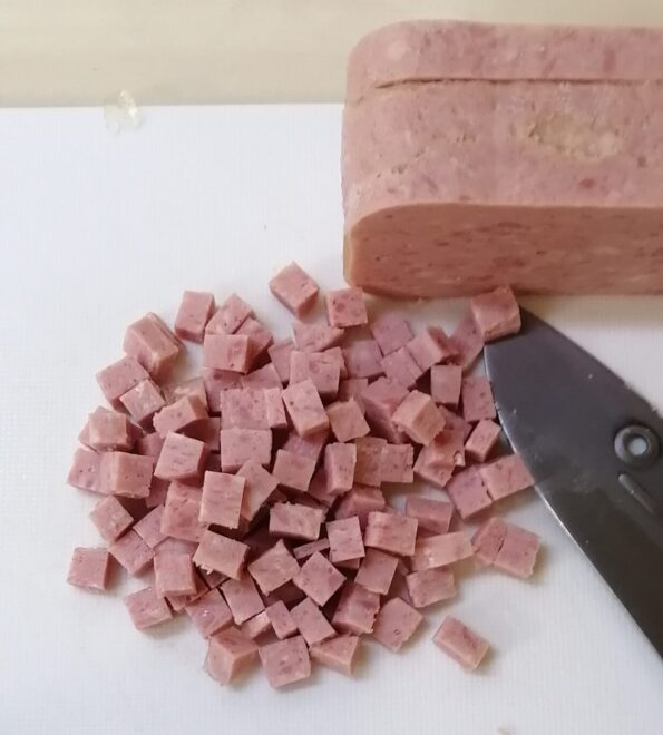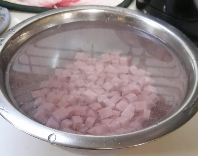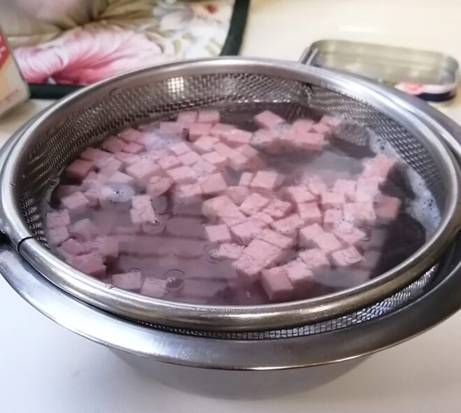 ランチョンミートは、その豊富な油分のせいで水に浮きやすいため、熱湯に数回晒して、ある程度油分を抜いてください