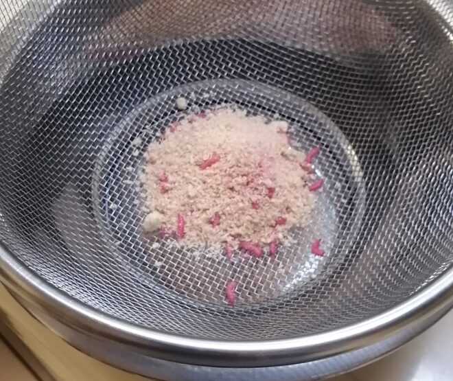 まず、サシ虫をザルにあけておがくずを取り除きます。
