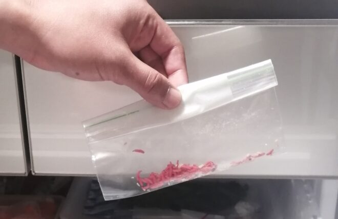 黒ずみを防ぐには、1回の釣行に必要な分のサシ虫を冷凍庫から取り出し、水を袋へ入れ、サシ虫を解凍してください。