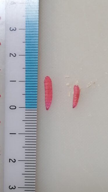 サシ虫を冷凍すると、サシ虫が死んで身が弛緩するので、ひと回り大きくなります。