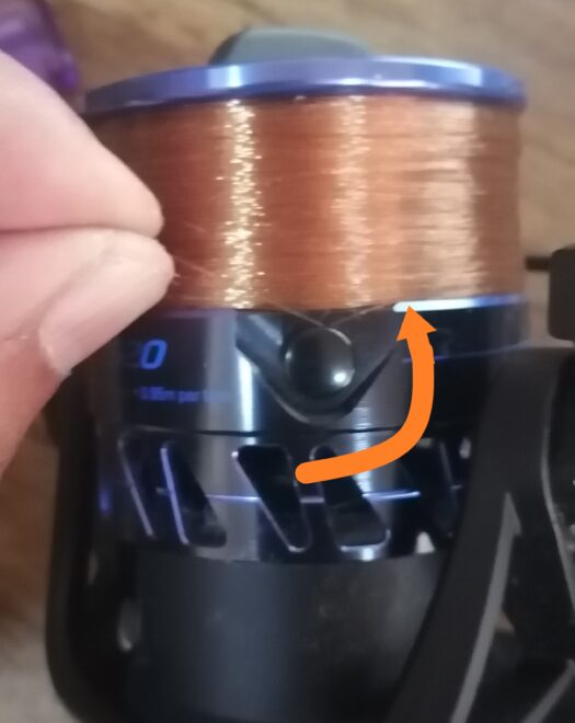 ③.ラインがラインクリップまで引き出された場合、太い糸を外すと、ラインが自由に放出できるようになります。