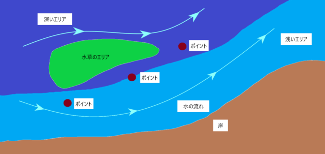 フナは、障害物が多く、流れが緩やかな場所を好みます。しかし、エサを底で食べるためには水草や藻などは邪魔になります。釣りを始める前に、ポイント周辺を丁寧に底探りし、平らで障害物のないポイントを見つけてください。