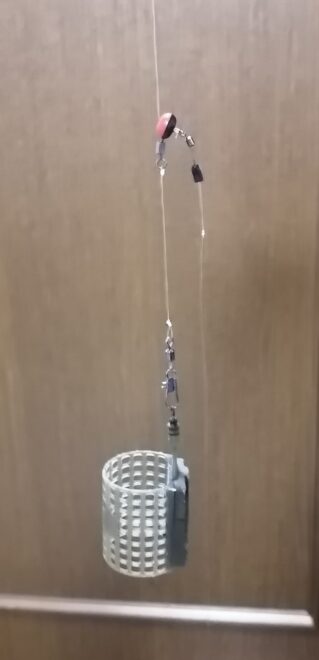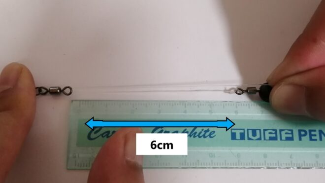 まず、フィーダーリンクをメインラインに通します。次に、メインラインをスイベルに結びます。スイベルの反対側にハリスを通して結びます。この時、ハリスの長さがフィーダーリンクとフィーダーの全長より長くなるようにしてください。