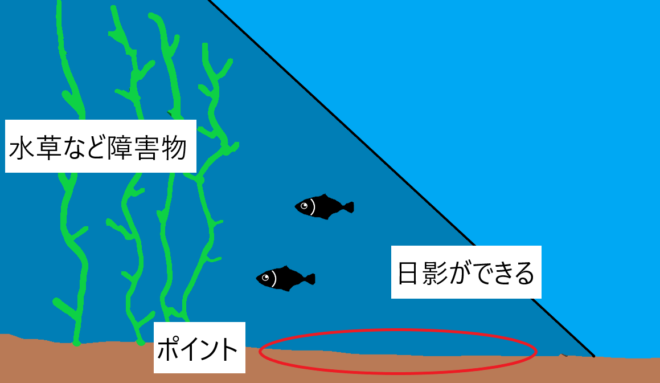 水草や藻は、酸素を生成します。また、背の高い水草は日陰や隠れる場所を魚に提供します。狙い目は、そのエリアの近辺、平坦で障害物のない場所になります。
