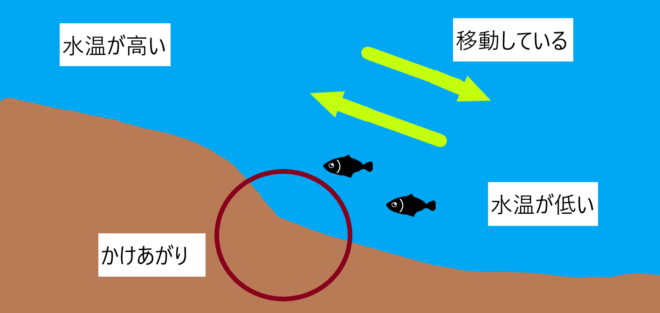 ①.浅い場所と深い場所の境目(かけあがり)を狙う