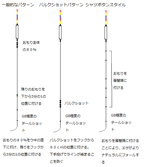 シャツボタンスタイルでは、おもりはワグラーからフックまでラインに沿って等間隔に付け、フックの近くに小さなテールショットを付けます
